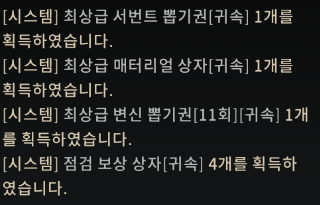 ▷ 이벤트 상품: 최상급 변신 뽑기권[11회] 1개, 최상급 서번트 뽑기권[11회] 1개, 최상급 매터리얼 상자 1개