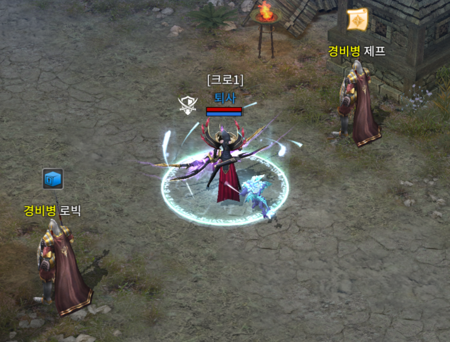 마을 왼쪽 입구에 경비병 머리위에 아이콘이 있어요