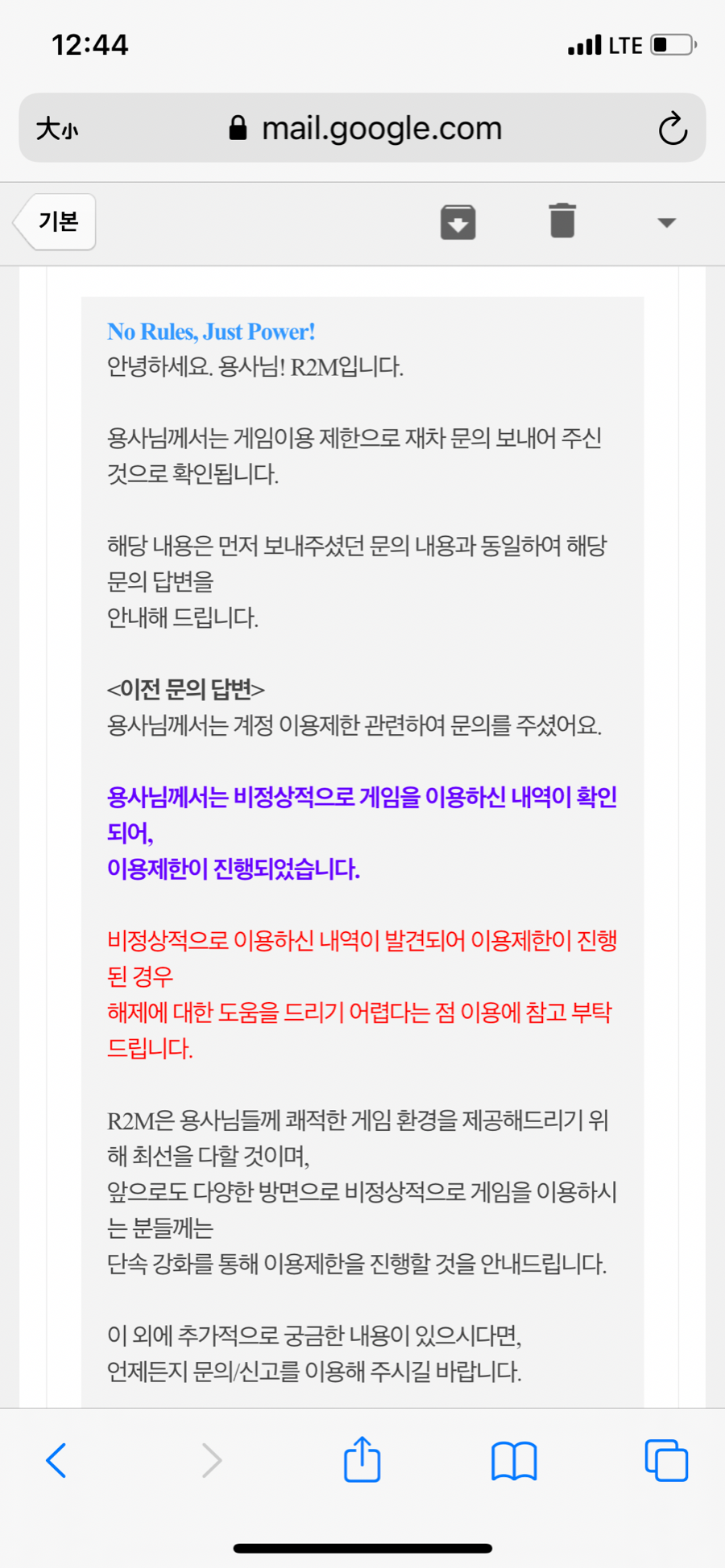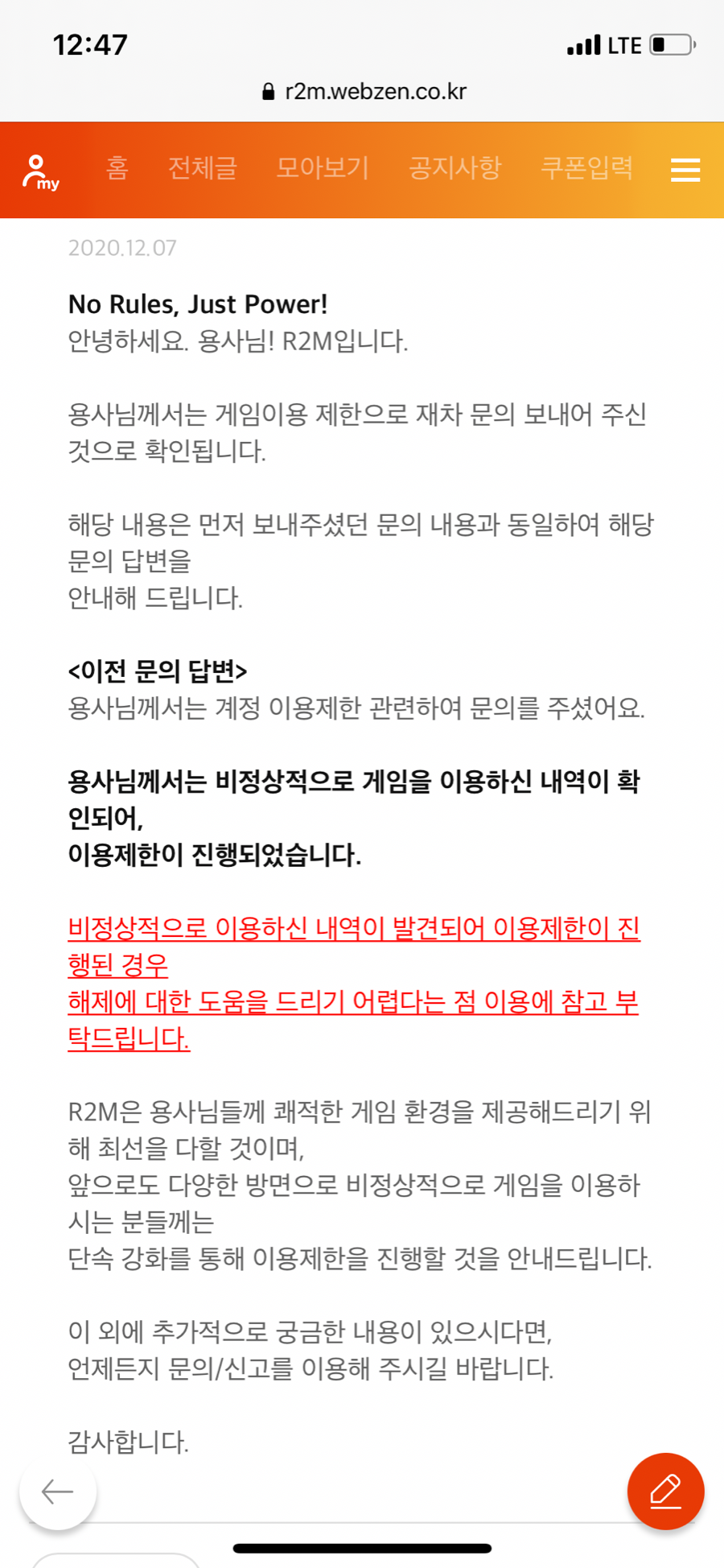 안녕하세요. 용사님! 정말 죄송하게도, 커뮤니티 내에서는 계정 정지와 관련된 내용 확인이 어렵습니다. ㅠ_ㅠ 위와 관련된 추가 문의사항은 커뮤니티 문의/신고 바로가기를 통해 1:1문의 접수를 부탁드립니다. 감사합니다.
