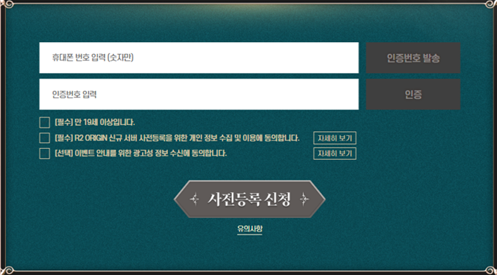 • 사전등록에 참여해 주신 모든 분들께는 R2 ORIGIN 신규 서버 오픈 후, 서버 오픈 안내 문자를 순차적으로 발송해 드릴 예정입니다.