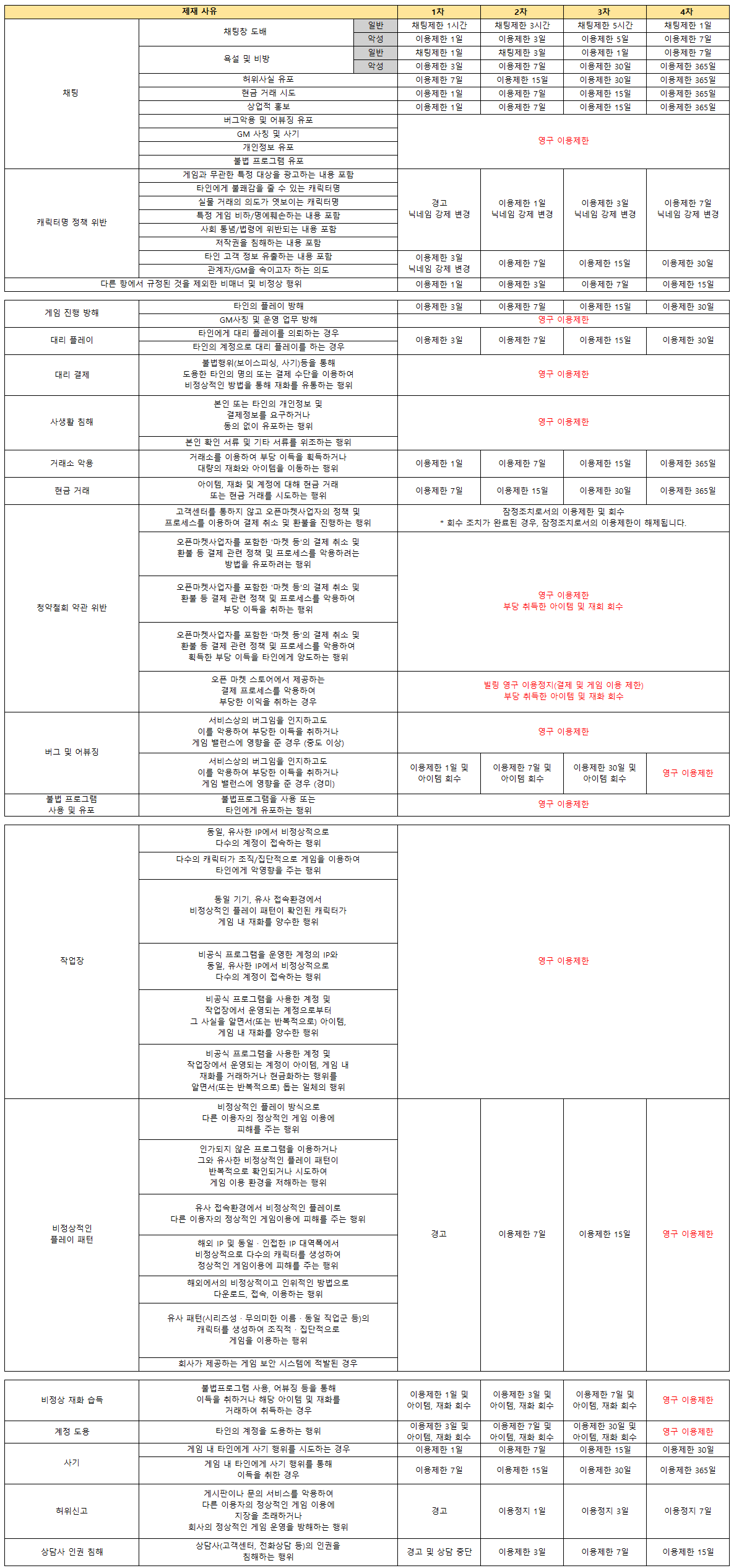 | 게시글/댓글 삭제 및 게임 및 커뮤니티 7일 이용정지 | 게시글/댓글 삭제 및 게임 및 커뮤니티 15일 이용정지 | 게시글/댓글 삭제 및 게임 및 커뮤니티 30일 이용정지 | 게시글/댓글 삭제 및 게임 및 커뮤니티 영구 이용정지 |