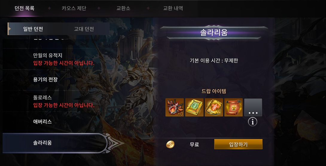 - 솔라리움은 다른 카오스 던전과 다르게 언제든지 입장이 가능합니다.